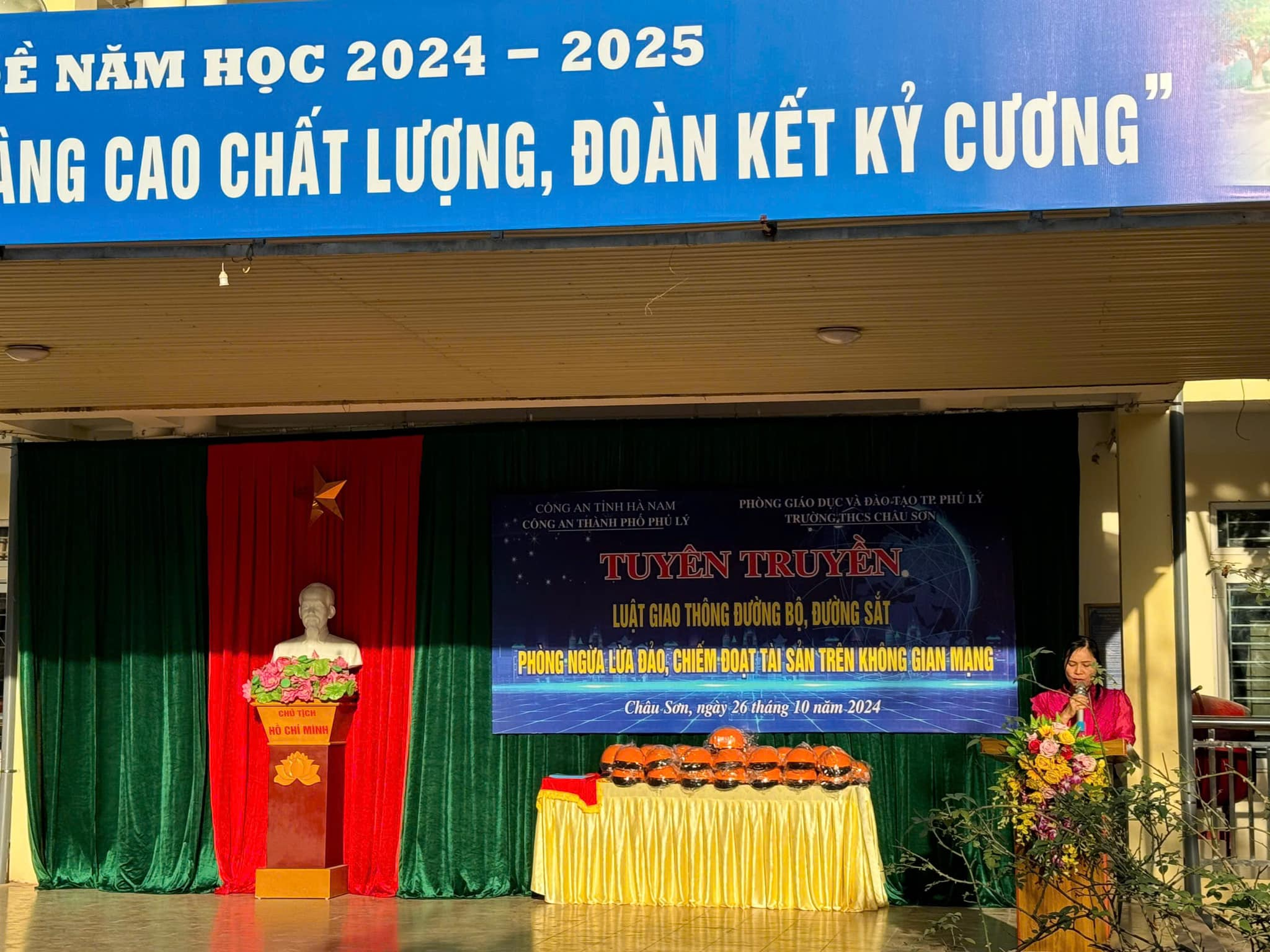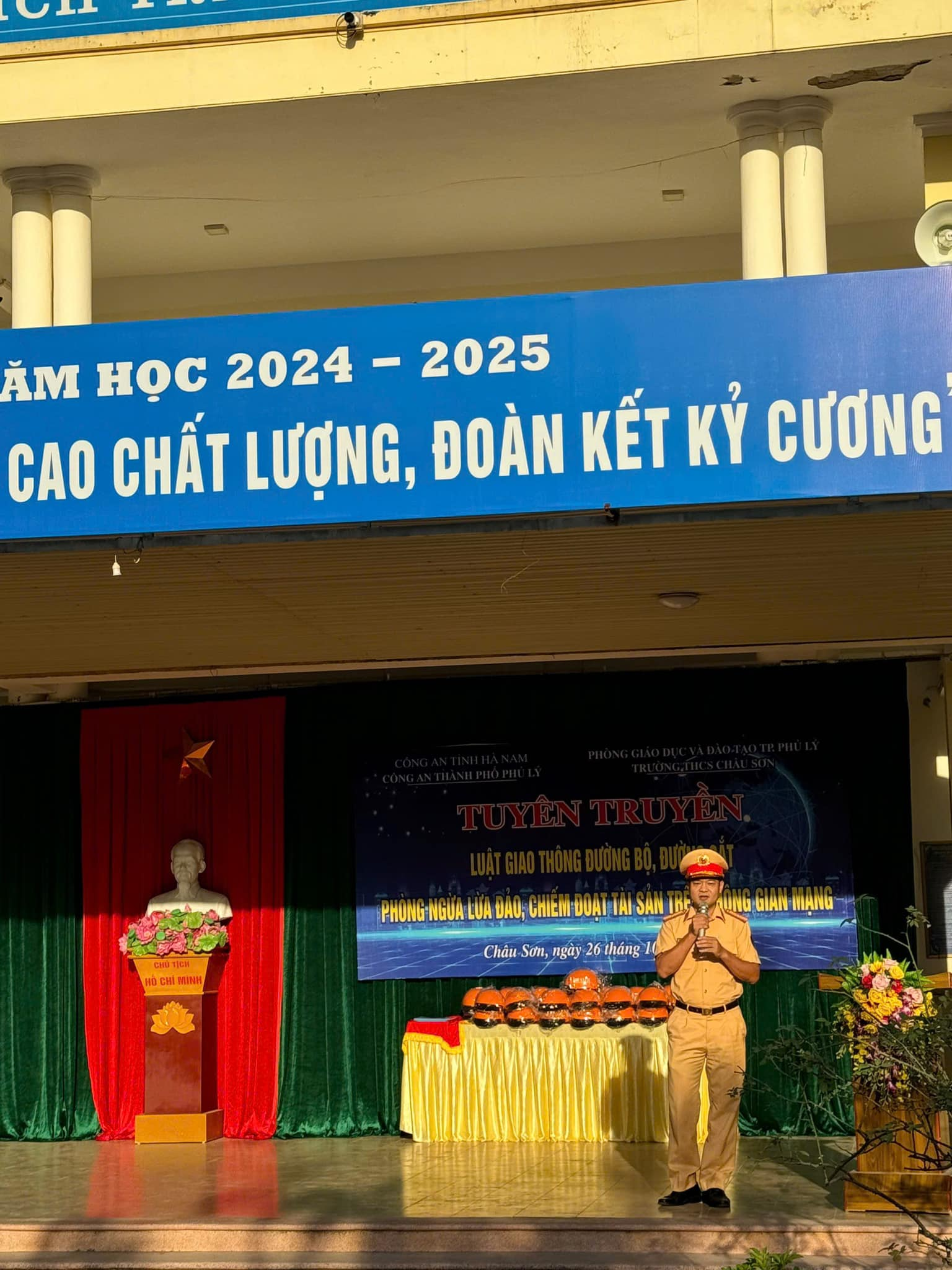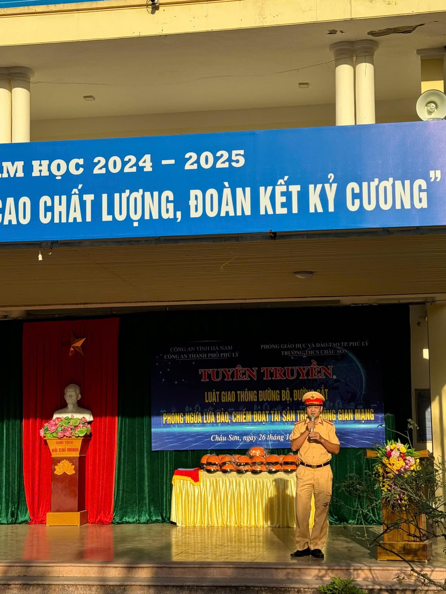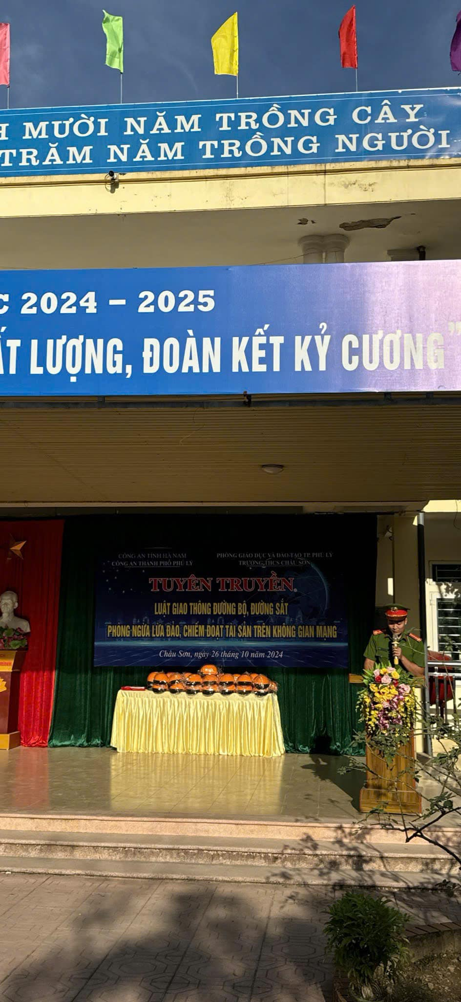 Sáng ngày 26/10/2024 . Công an thành phố Phủ Lý và công an Phường Châu Sơn phối hợp với Trường THCS Châu Sơn tổ chức tuyên truyền luật ATGT đường bộ và đường sắt,phòng ngừa lừa đảo chiếm đoạt tài sản trên không gian mạng cho giáo viên và học sinh của trường