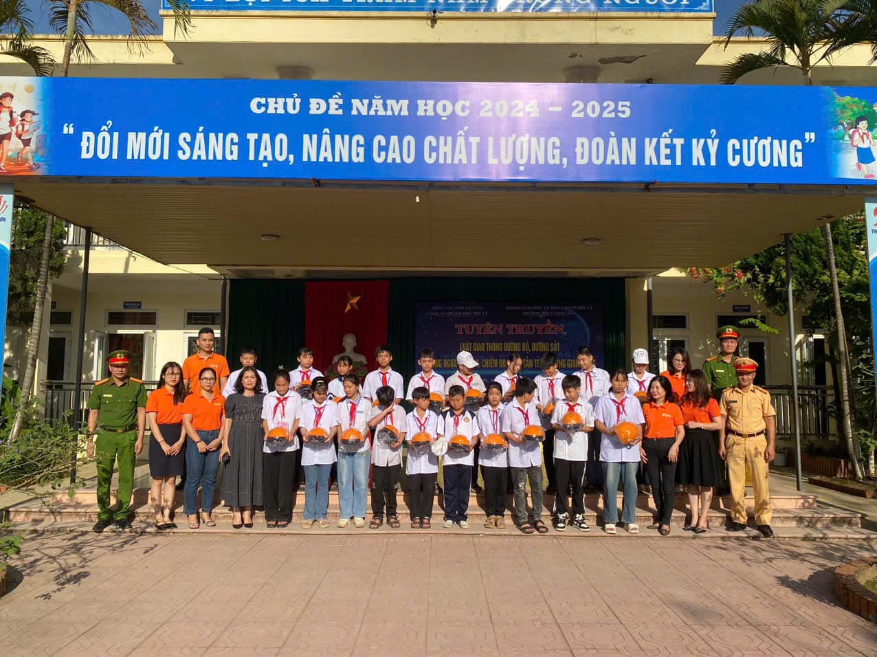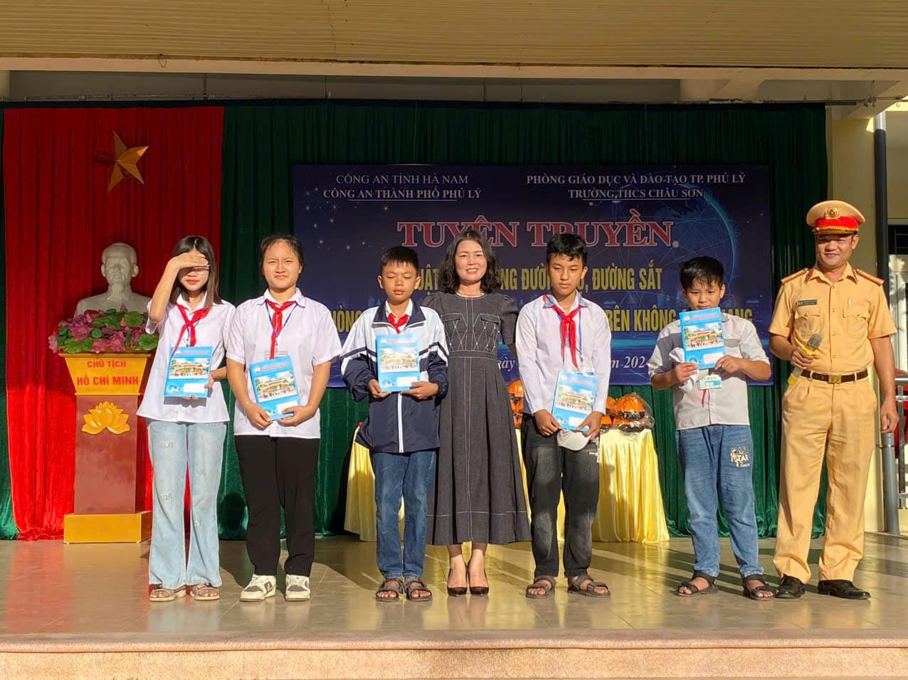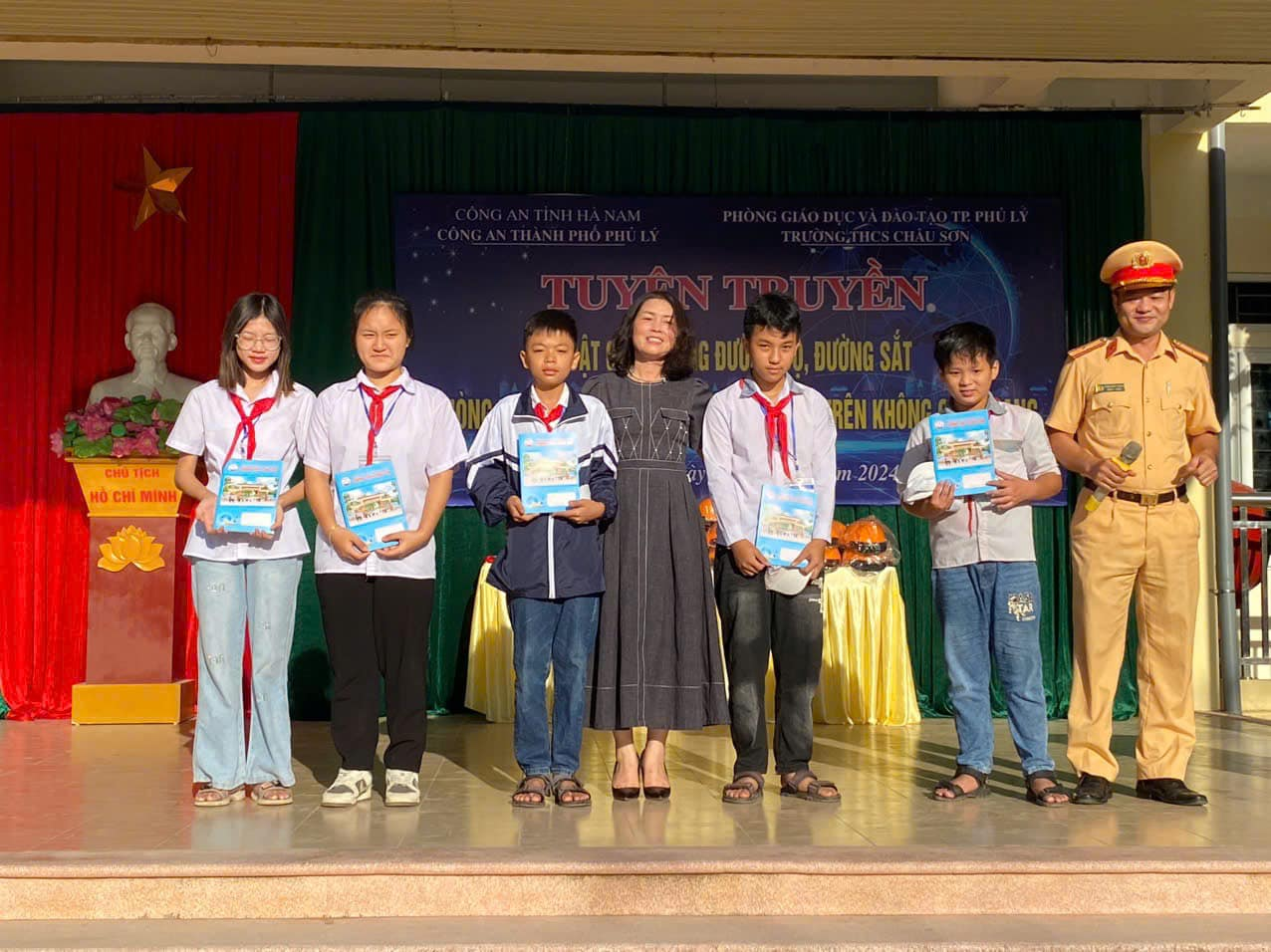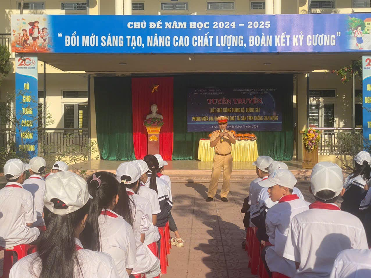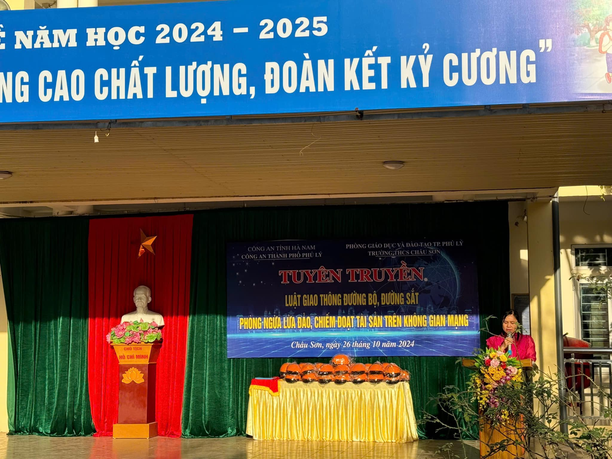 Sáng ngày 26/10/2024 . Công an thành phố Phủ Lý và công an Phường Châu Sơn phối hợp với Trường THCS Châu Sơn tổ chức tuyên truyền luật ATGT đường bộ và đường sắt,phòng ngừa lừa đảo chiếm đoạt tài sản trên không gian mạng cho giáo viên và học sinh của trường