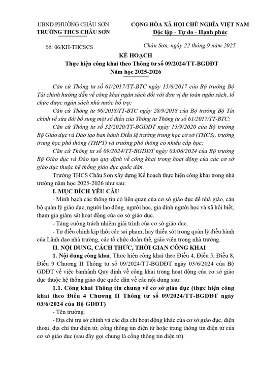 Công khai Kế hoạch công khai theo thông tư 09