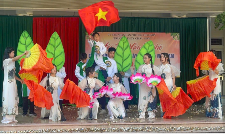 • Học sinh Trường THCS Châu Sơn biểu diễn hát chèo trong Lễ sơ kết học kì I năm học 2025–2026.